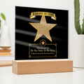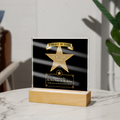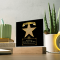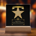 Your plaque will be crafted from premium acrylic with a professionally printed design for a polished look. It comes with a stylish wooden LED base, and you can choose between a USB plug-in option OR a cordless battery-operated option (requires 2 AAA batteries, not included). Both LED bases feature 7 vibrant colors, allowing the user to customize the lighting with various color changes and dynamic cycles.