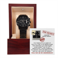 A handsome gift that can withstand constant use, this Black Chronograph Watch is perfect for all the special men in your life. A thoughtful present to your groomsmen, an anniversary memento, or a long-lasting keepsake for Father’s Day - it's a versatile piece sure to warm hearts and create smiles. Featuring a three-dial face, calendar function, and luxury pointer in a water-resistant and scratch-proof vessel.