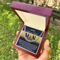 Your piece is lovingly packaged in a complimentary soft touch box for easy gifting. Elevate your presentation by upgrading to the mahogany style luxury box, which features a brilliant LED spotlight.
